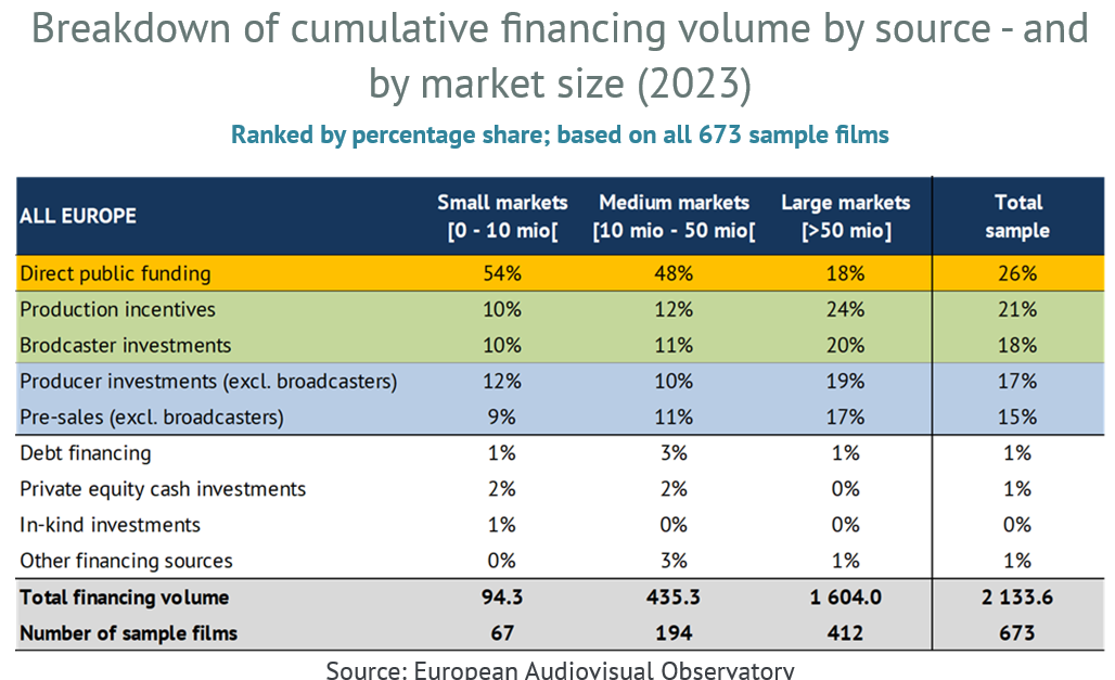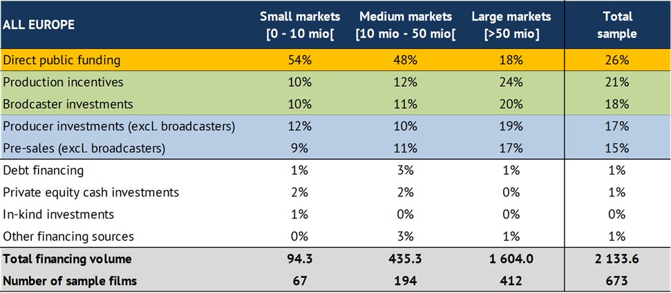 - Both average budgets as well as financing structures differ significantly between markets. In particular, the percentage share of direct public funding in film financing decreases with increasing market size and budget volume.