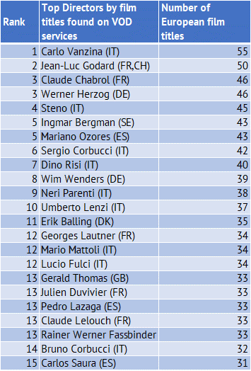 - Italian Director Carlo Vanzina is the European director with the most titles on VOD in Europe, ahead of Jean-Luc Godard, Claude Chabrol and Werner Herzog.