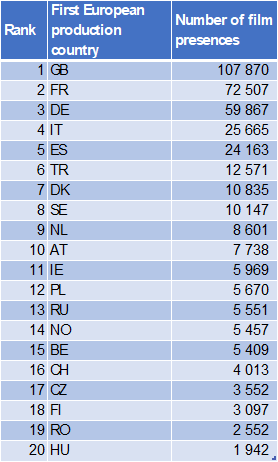 The top 5 European production countries by film presence correspond to the top 5 European production by film titles, the United Kingdom, France, Germany, Italy and Spain. In addition to 15 EU countries, 5 other European countries (members of the Council of Europe) are part of the top 20 production countries of European films by presence: United Kingdom, Turkey, Russia, Norway and Switzerland.