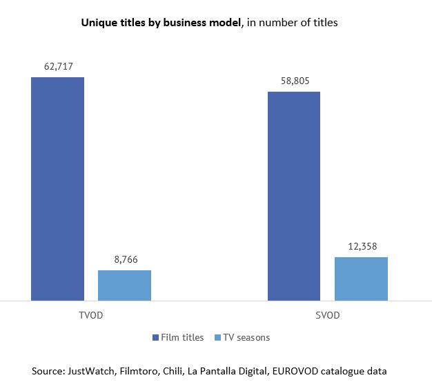 In all, there are 7 times more single film titles on TVOD than single TV seasons (62 717 unique film titles versus 8 766 unique TV seasons) and 4.75 times more single film titles than TV seasons on SVOD (58 805 unique film titles versus 12 358 unique TV seasons)