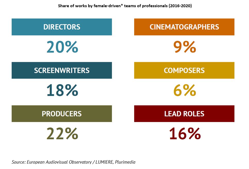 - Between 2016 and 2020 the average share of female directors per film was only 20%, with no significant evolution over the years. This figure was 25% for screenwriters.