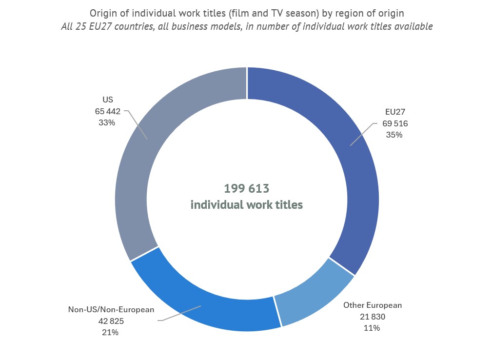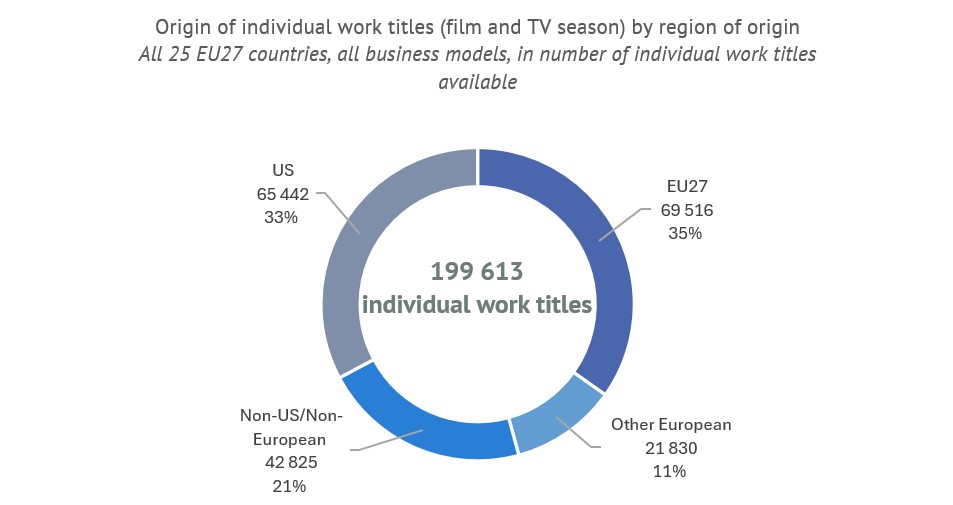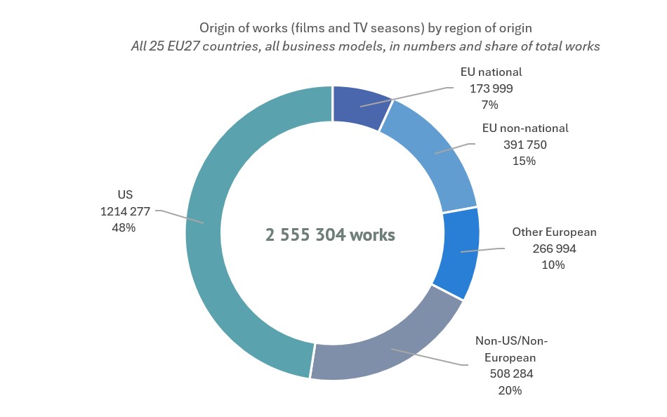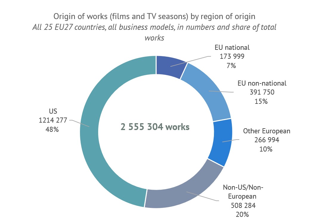 - US works account for almost half of all works available: US works represented 48% of the more than 2.5 million work presences in EU27 VOD catalogues but only 33% of all titles available on VOD.