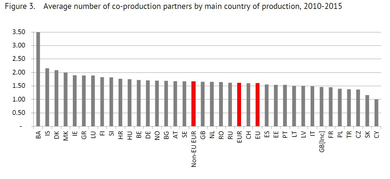 The average number of co-production partners increased over the period covered; in the EU, it rose from an average 1.48 co-production partners in 2010, to 1.65 in 2015. A total of 27 countries were within a bracket of 1.45-two co-production partners on average, per co-production. The figure rose above two in only four countries.