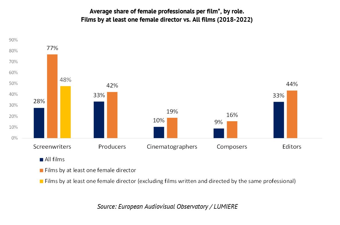 Considering off-screen roles, the average female presence per film in each professional category was higher in films co-directed by at least one woman than in films in general. For instance, for films directed by at least one woman, the average share of female screenwriters per film was 77% (compared to 28% for films in general). This figure was 48% when excluding films written and directed by the same person.