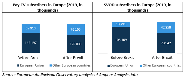 • Due to Brexit, the European Union loses 11% of its pay-TV subscribers and 23% of its SVOD subscribers.