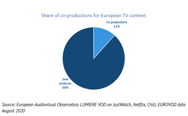 Only 12% of all European TV content available were co-productions, which is significantly lower than for films (30%). But when looking only at majority European productions, the share of co productions lowers even more to 9%.