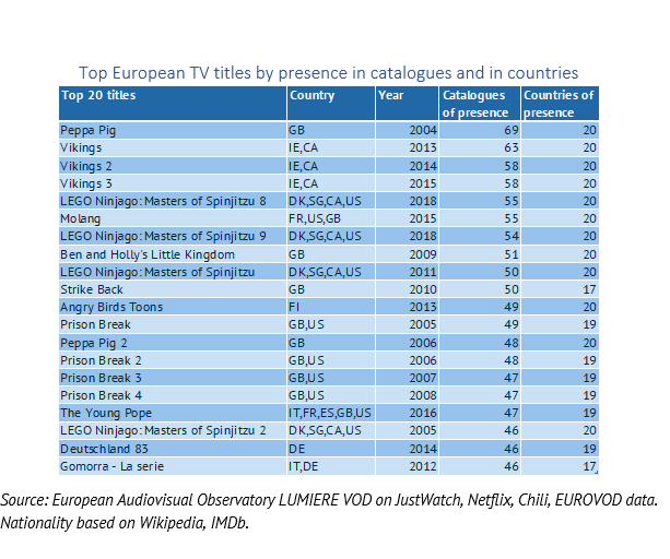 - The British animation series ‘Peppa Pig’ (season 1) was the top TV title present in VOD catalogues in Europe. This series also represented the oldest content in our list of top 20 TV seasons