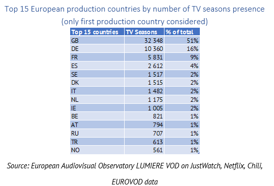 - The United Kingdom was the main provider and exporter of TV content as it produced half of all European TV seasons available on VOD in Europe