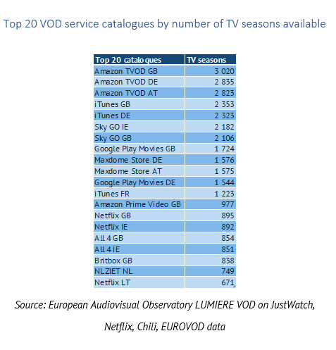 While TVOD services Amazon, iTunes and Maxdome offer the highest average number of European TV seasons in the countries they are available, Netflix and Amazon Prime Video are SVOD pan European players offering on average 597 and 290 European TV seasons in their country catalogues respectively.