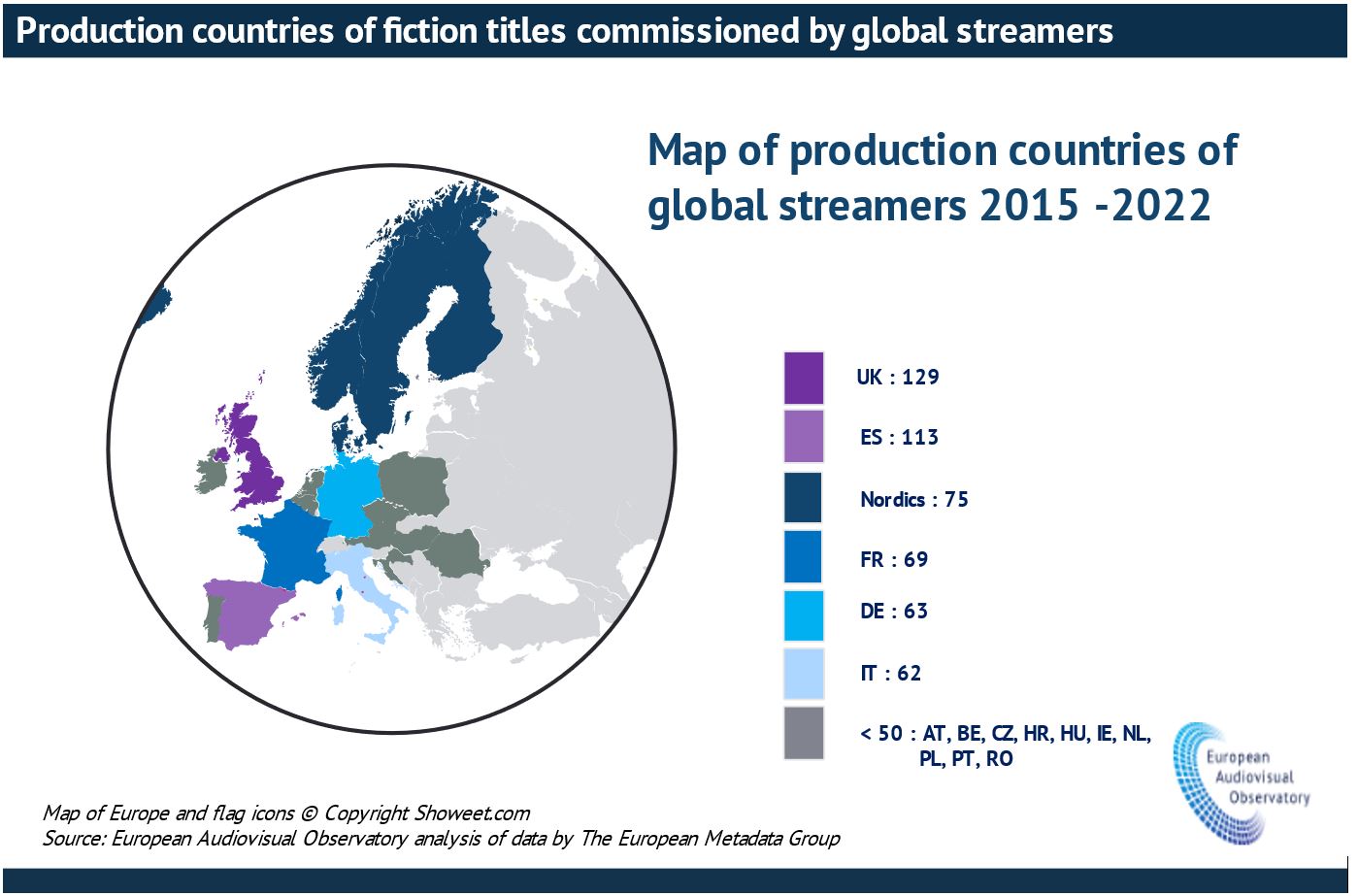 In 2022, most TV fiction commissioned by global streamers was produced in Spain and the United Kingdom (39 titles each), both homes to Netflix production hubs in Madrid and British Shepperton Studios. Other significant production hubs for streamers were the Nordic countries and France (2015-2022).