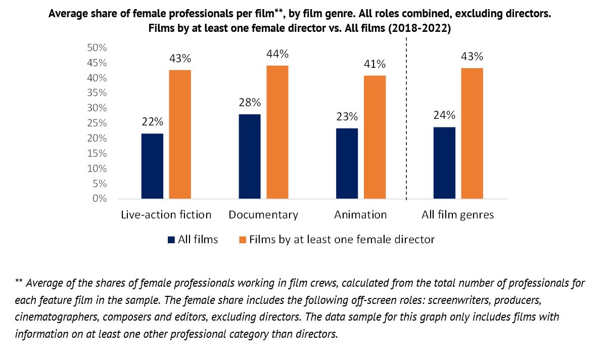 - Documentary was the film genre with the highest share of female professionals, taking into consideration all crew roles.
