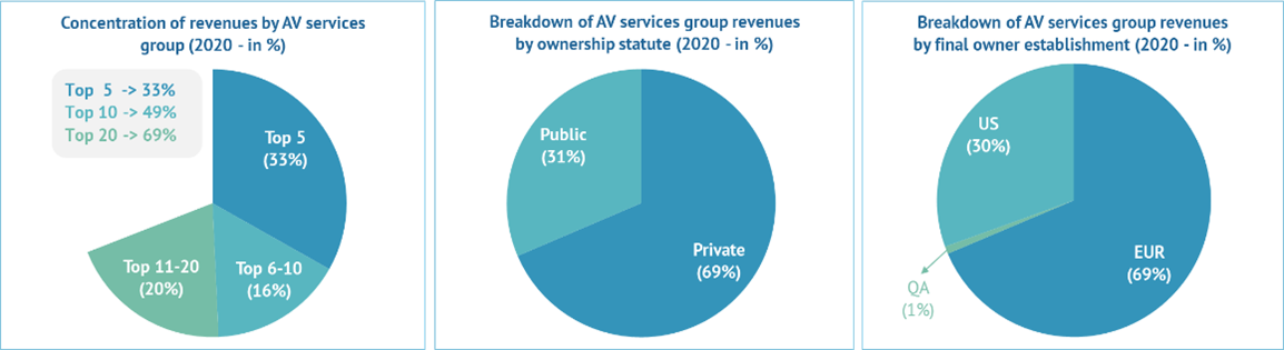 Concentration remains similar over the analysed period, with the top 20 players accounting for around 70% of the top 100 European AV groups by operating revenues. Although this percentage is much higher in the private sector (85%), it still shows less concentration when compared to the US market.