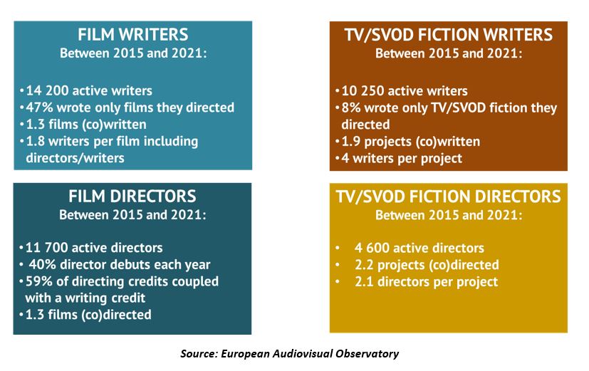 This brand-new report: “Writers and directors of film and TV/SVOD fiction: 2015-2021 figures ” has just been published by the European Audiovisual Observatory, part of the Council of Europe in Strasbourg. This report provides an analysis of writers and directors of European theatrical films and TV/SVOD fiction produced in Europe between 2015-2021.