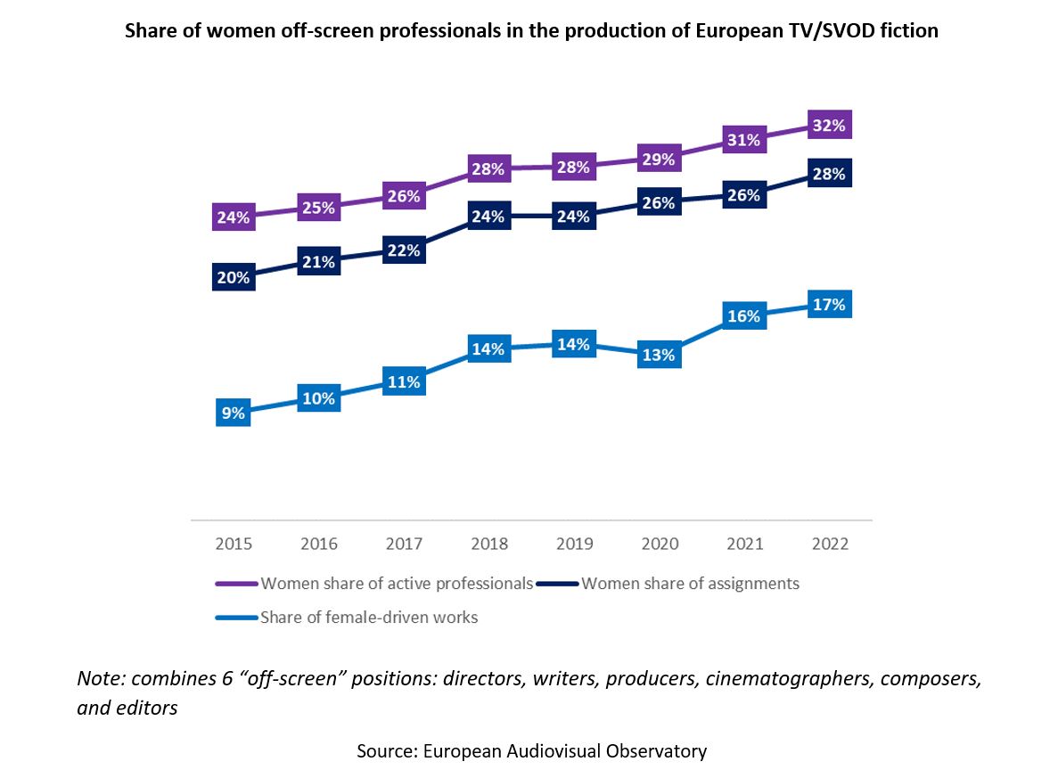 - In 2022, the share of women professionals in the production of TV and SVOD fiction was 28%. The low share results from three cumulative factors: