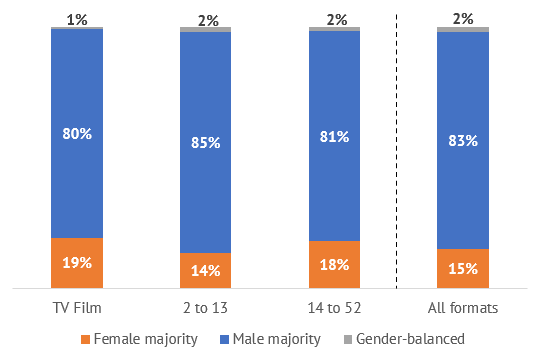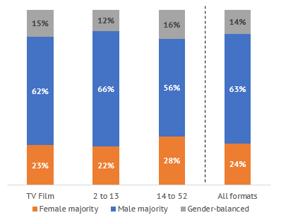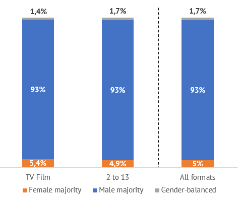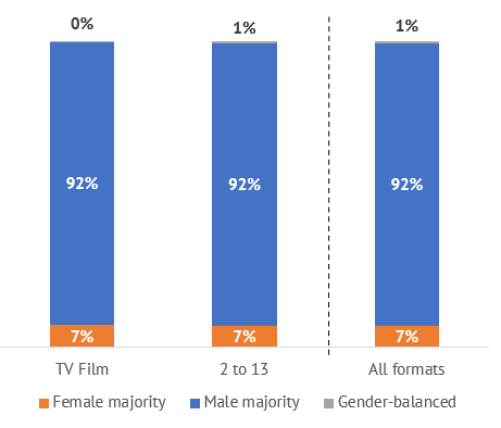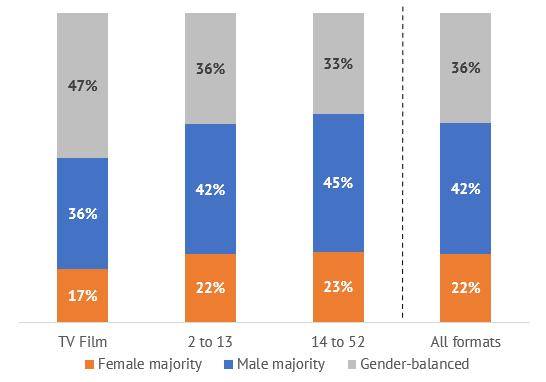 68% of TV fiction titles were the work of writers’ teams, of which 36% were written by writers of both genders and 13% by gender-balanced teams of writers.