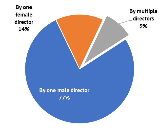 The share of titles by female-driven production teams was 36%, as women working alone produced fewer titles than men but also, when producing in teams, they were often part of a gender-balanced team of producers.