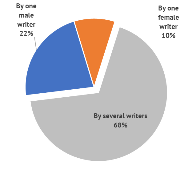 The share of episodes written by female-driven teams was only 24%, because female writers were proportionally more likely than male colleagues to co-write audiovisual fiction and when they did, it was often within teams with a male majority.
