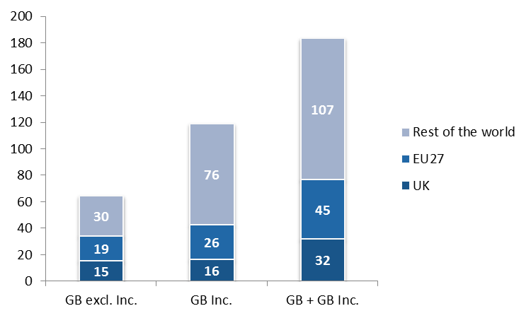 EU27 countries account for 29.0% (excluding GB Inc.) and 24.5% (including GB Inc.) of UK films’ worldwide admissions.