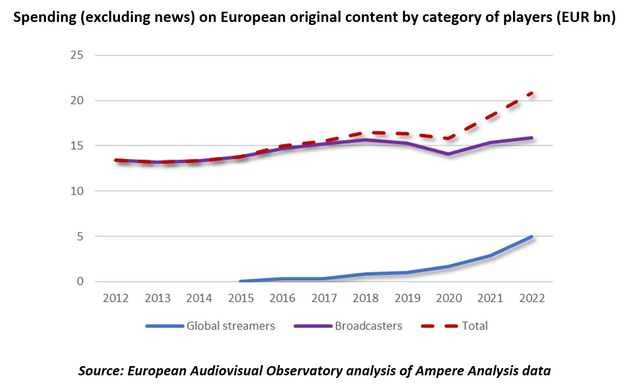 This brand new report: “Audiovisual services spending in original European content - a 2012-2022 analysis ” has just been published by the European Audiovisual Observatory, part of the Council of Europe in Strasbourg. This report provides an analysis of investments made by broadcasting groups and streamers in original European content.