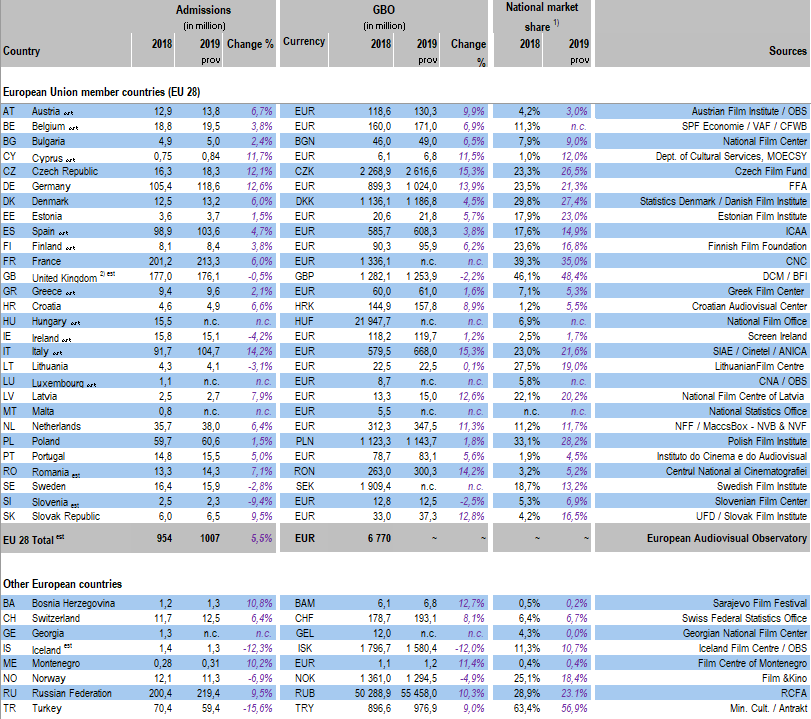 Outside the EU, the Russian market once again crossed the 200 million threshold, recording a total of 219.4 million admissions in 2019 (+9.5% on the previous year). This sets a new record in recent history and confirms Russia’s position as Europe’s largest cinema market in terms of admissions, ahead of France. In contrast, Turkey registered a decrease in cinema attendance, with admissions down from 70.4 million in 2018 to 59.4 million in 2019.
