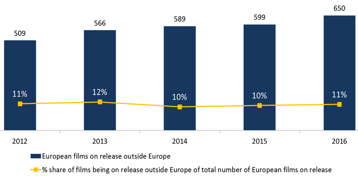 650 European films were on theatrical release in at least one of the markets covered in 2016. This is an 8.5% rise year on year compared with 2015. This is the largest number of European films released outside Europe in the past five years and represents about 11% of the total number of European films on release worldwide (see Figure 1 below).