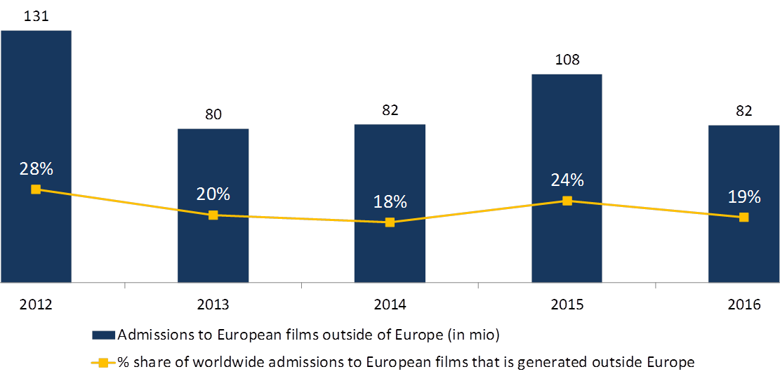 Figure 2. Admissions to European films outside Europe 2012-2016 (in million)