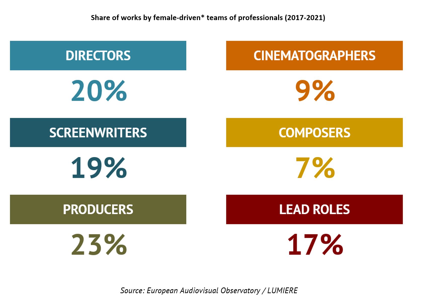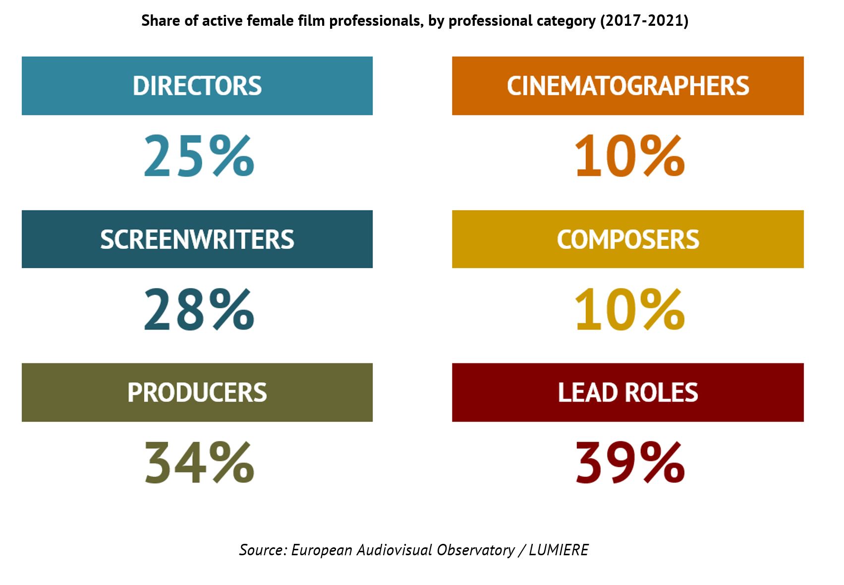 - Concerning behind-the-camera roles, the highest female presence was registered among producers (34%) and screenwriters (28%).