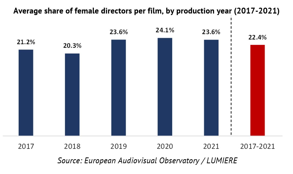 On average, female professionals in film crews worked on slightly fewer feature films than their male counterparts in the time period studied. As a result, when looking at the proportion of women and men among the total number of directors of each film, the average share of female directors per film was only 22% between 2017 and 2021. This figure is lower than the share of women among all active directors in the workforce (25%).
