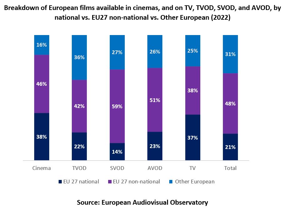 Breakdown of European films available in cinemas, and on TV, TVOD, SVOD, and AVOD,