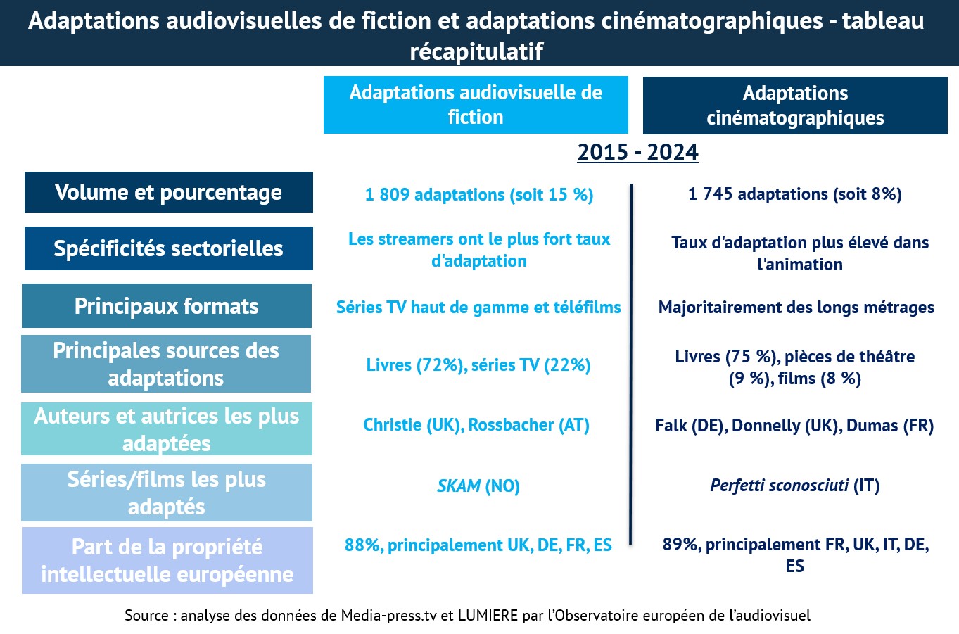 L’Observatoire européen de l’audiovisuel, qui fait partie du Conseil de l’Europe à Strasbourg, France, vient de publier un nouveau rapport intitulé Adaptations in film and audiovisual fiction production in Europe - 2015-2024 figures. Ce rapport analyse l'évolution de la production européenne de longs métrages et d'œuvres de fiction audiovisuelles entre 2015 et 2024 et fournit des données quantitatives et qualitatives sur les diverses sources dont s’inspire la production de contenus audiovisuels et cinématographiques en Europe.