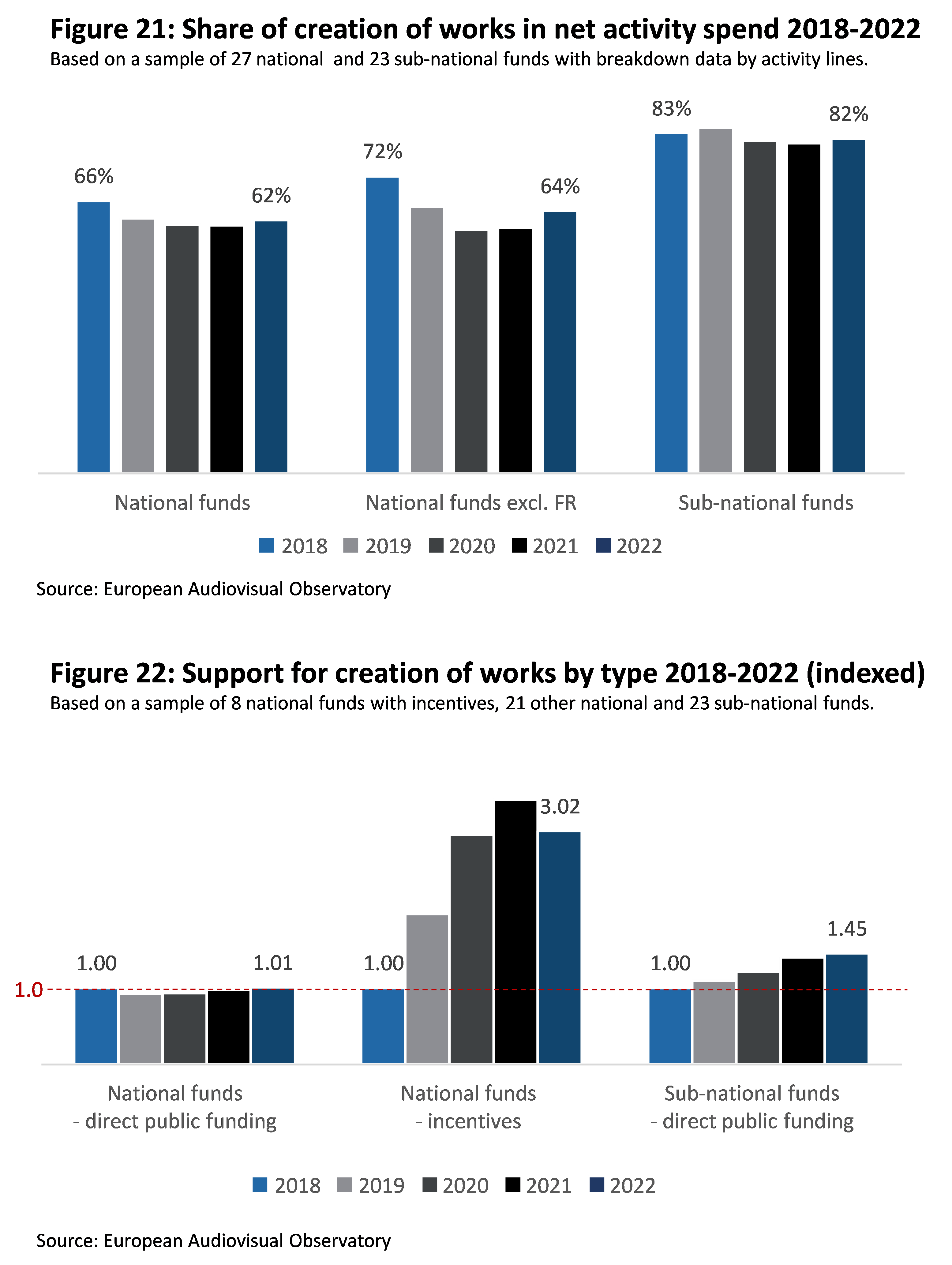 Conformément à la mission initiale de la plupart des fonds cinématographiques, la majeure partie de leur financement a toujours été consacrée au soutien à la création, et la période 2018-2022 ne fait pas exception à la règle. Dans le cas des fonds nationaux, 62 % des subventions publiques directes ont été affectés à la production (58 %) et au développement (4 %) de films et autres œuvres audiovisuelles. Dans le cas des fonds infranationaux, dont le mandat est généralement plus restreint que les fonds nationaux, la part du soutien à la création est nettement plus élevée, à savoir 82 % de leurs dépenses nettes cumulées (soit 73 % pour la production et 8 % pour le développement).