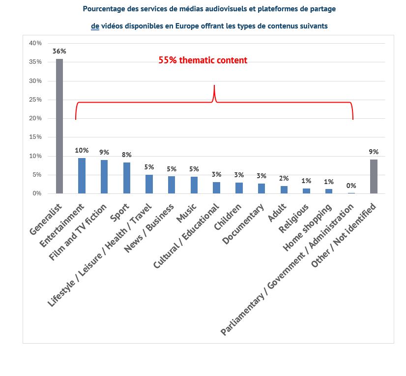 Le type de contenu des chaînes publiques et des services publics de VOD/plateformes de partage de vidéos est très différent. Alors que les chaînes publiques spécialisées dans le cinéma et les fictions télévisées sont pratiquement inexistantes, 14 % des services publics de VOD sont spécialisés dans ce type de contenu. Les médias de service public ont manifestement axé leur présence en ligne sur des contenus thématiques ciblant des publics spécifiques afin de s’adapter au mode de consommation numérique et à la fragmentation de l’audience.