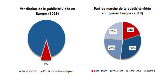 - YouTube et Facebook détiennent ensemble 56 % du marché de la publicité vidéo en ligne en Europe.