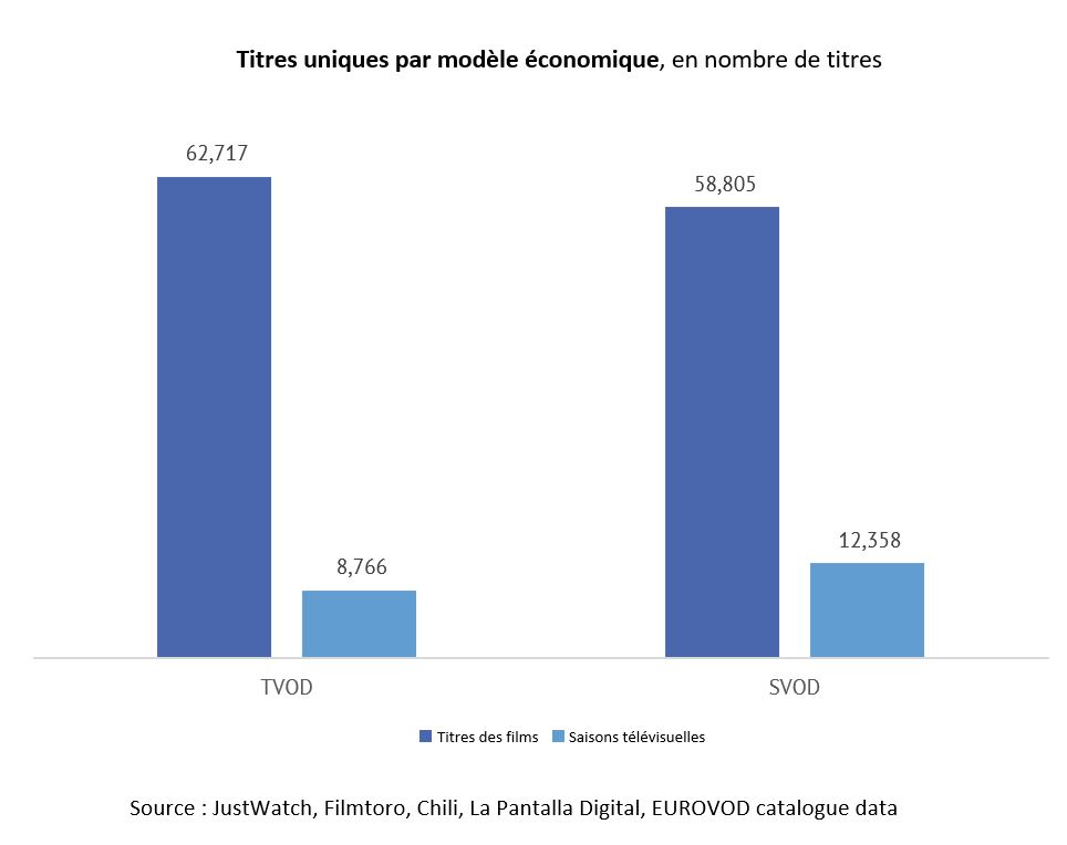 Au total, il y a 7 fois plus de titres uniques de films en TVOD que de saisons télévisuelles individuelles (62 717 titres uniques de films contre 8 766 saisons télévisuelles individuelles) et 4,75 fois plus de titres uniques de films que de saisons télévisuelles en SVOD (58 805 titres de films individuels contre 12 358 saisons télévisuelles individuelles).