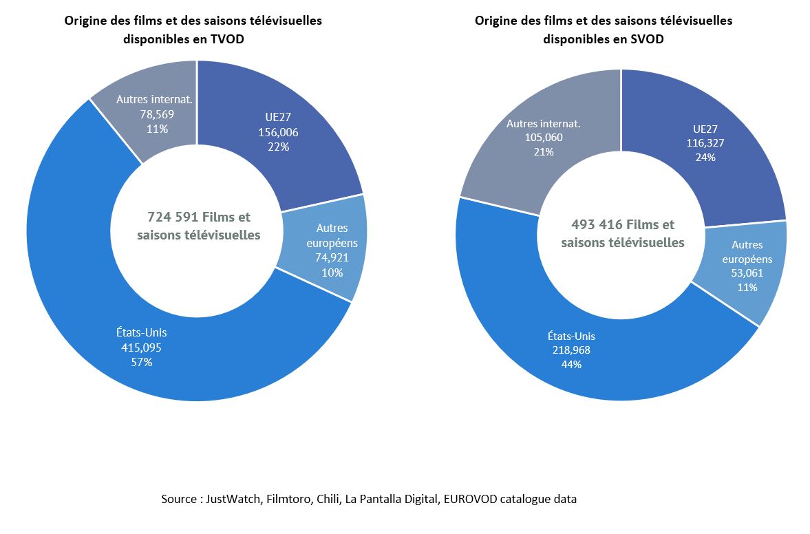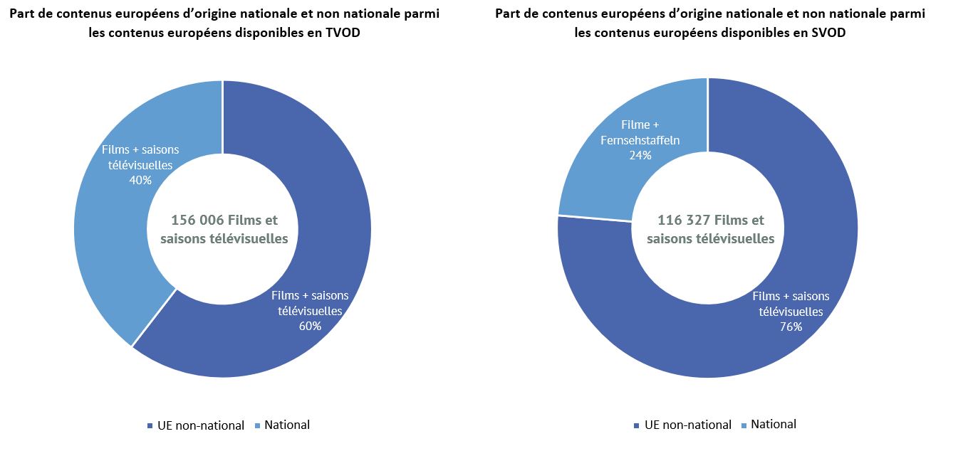 - 60 % de l’ensemble des contenus européens disponibles en TVOD sont européens d’origine non nationale, contre 76 % sur les services de SVOD.