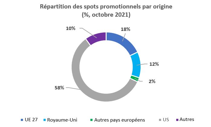 L’analyse de la page d’accueil d’un échantillon de 54 services de TVOD dans 9 pays européens montre que les œuvres européennes représentent 32 % des spots promotionnels, dont 18 % pour des œuvres originaires de l’UE27. Dans tous les pays étudiés, à l’exception du Royaume-Uni et de la France, la majorité des spots promotionnels dédiés à des œuvres européennes concerne des titres non nationaux.