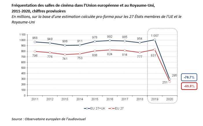 Sur la base des premières données, l'Observatoire européen de l'audiovisuel estime que la fréquentation des salles de cinéma dans l'Union européenne et au Royaume-Uni a chuté, passant à 294,7 millions d'entrées en 2020.