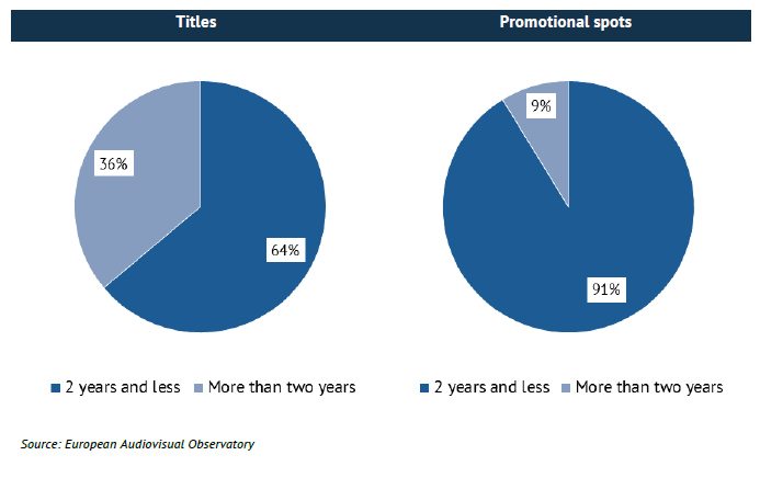- La promotion cible massivement les films récents (91%). Non seulement les films récents ont plus de chances d'être promus, mais ils ont également davantage de spots promotionnels par film.
