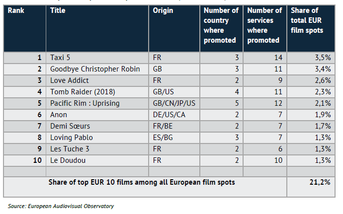 - Les campagnes de promotion des films européens se concentrent sur un nombre limité de titres : la part du top 10 des spots promotionnels pour films européens est supérieure à celle des spots pour films américains si l'on considère la situation pays par pays. Le top 10 des films européens les plus promus révèle une forte présence du Royaume-Uni (dont 2 productions soutenues par des studios américains) et de la France.