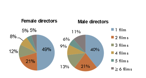 Les réalisatrices ont tendance à réaliser moins de films que leurs homologues masculins : 49 % des femmes incluses dans notre échantillon n’ont réalisé qu’un seul film entre 2003 et 2017, contre 40 % pour les hommes. Seulement 30 % des réalisatrices ont travaillé sur plus de deux films au cours de la même période, contre 39 % des réalisateurs masculins. En moyenne, chaque réalisatrice a tourné 1,4 film entre 2003 et 2017, contre 1,6 pour les réalisateurs masculins.
