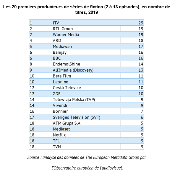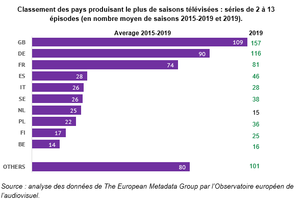 - Si l’on considère les séries télévisées de 2 à 13 épisodes, le Royaume-Uni, l’Allemagne et la France sont les plus grands producteurs en nombre de titres. L’Allemagne est de loin le plus grand producteur de téléfilms.