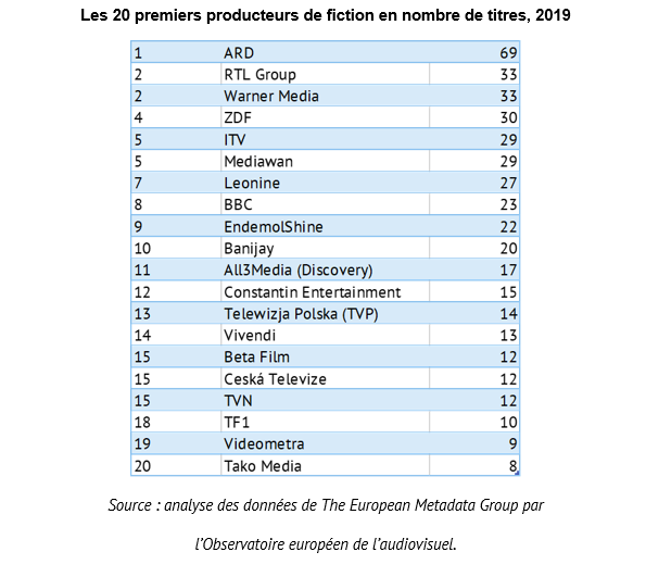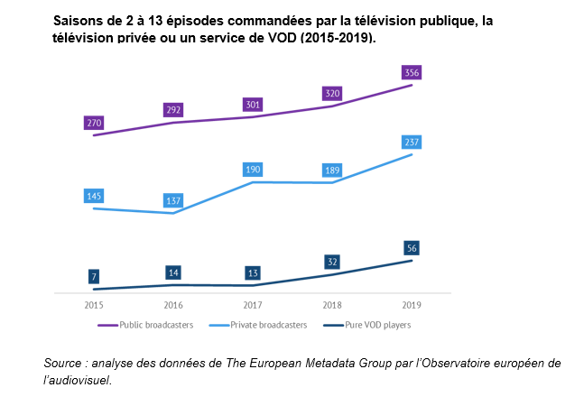 - Les chaînes de télévision privées sont en tête de la production de fictions télévisées, tous formats confondus, car ils ont globalement tendance à privilégier les soaps et les telenovelas, de plus longue durée. Les diffuseurs publics, quant à eux, produisent davantage de séries de 2 à 13 épisodes.