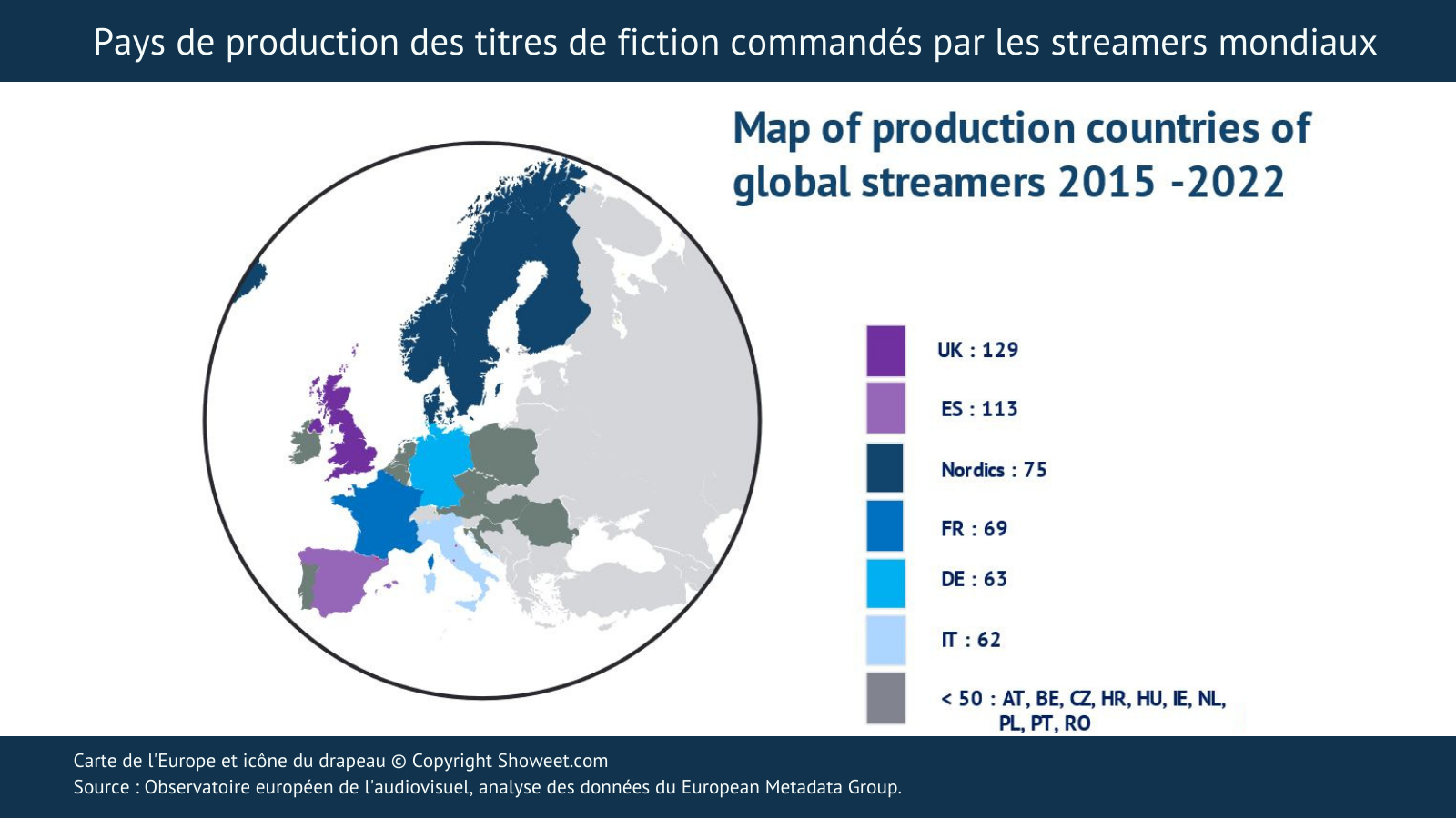 En 2022, la plupart des fictions télévisées commandées par les streamers mondiaux ont été produites en Espagne et au Royaume-Uni (39 titres par pays), dans les studios de Netflix à Madrid et les studios britanniques de Shepperton. Les pays nordiques et la France sont également des lieux de production appréciés par les streamers (2015-2022).