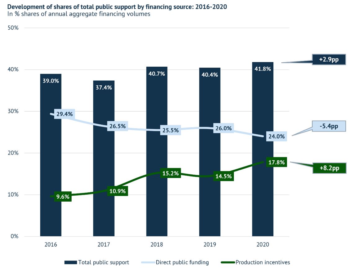 - La hausse des incitations à la production comme source de financement des films européens compense la baisse des subventions publiques. Par conséquent, la part de l’aide publique globale a légèrement augmenté, passant de 39,0 % en 2106 à 41,8 % en 2020. Les films dont le budget est supérieur à 5 millions d’euros (films à très gros budget) ont enregistré la plus forte hausse des subventions publiques.