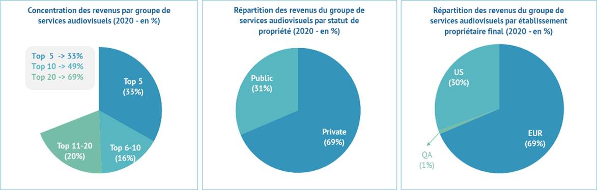 La concentration reste similaire sur la période analysée, les 20 premiers acteurs représentant environ 70 % des 100 premiers groupes audiovisuels européens en termes de recettes d'exploitation. Bien que ce pourcentage soit beaucoup plus élevé dans le secteur privé (85 %), il révèle tout de même une moindre concentration par rapport au marché américain.