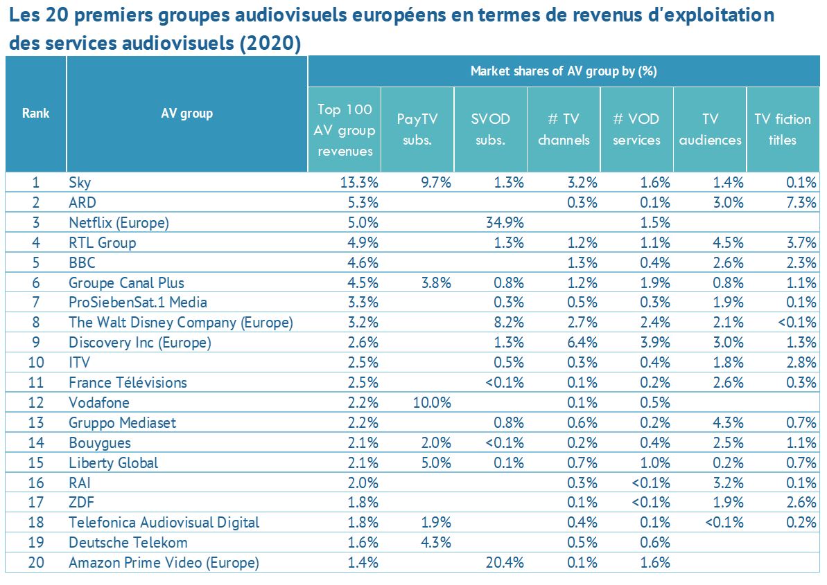 Ce tout nouveau rapport intitulé Top players in the European audiovisual industry - ownership and concentration - 2021 Edition est publié par l'Observatoire européen de l'audiovisuel, qui fait partie du Conseil de l'Europe à Strasbourg.