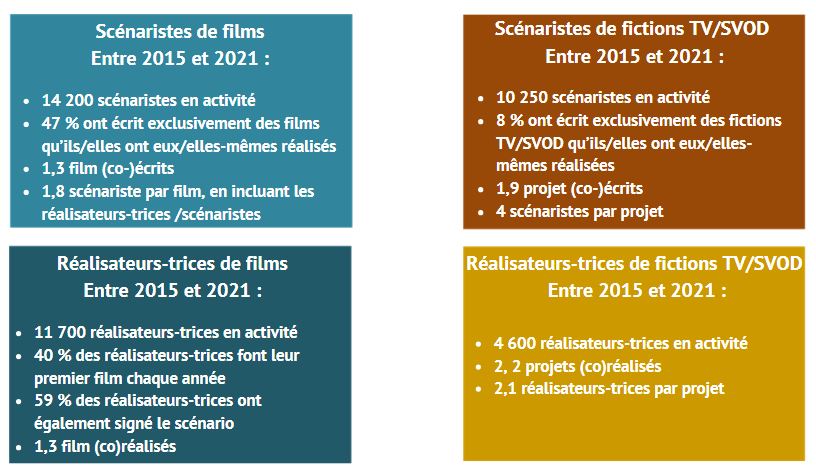 - Un roulement continu : De 2015 à 2021, les scénaristes de films cinématographiques ont écrit en moyenne 1,3 film et les scénaristes de fictions TV/SVOD ont participé en moyenne à 1,9 film ou série TV ; sur la même période, les réalisateurs-trices de films cinématographiques ont réalisé en moyenne 1,3 film et les réalisateurs-trices de fictions TV/SVOD ont participé en moyenne à 2,2 films ou séries TV.