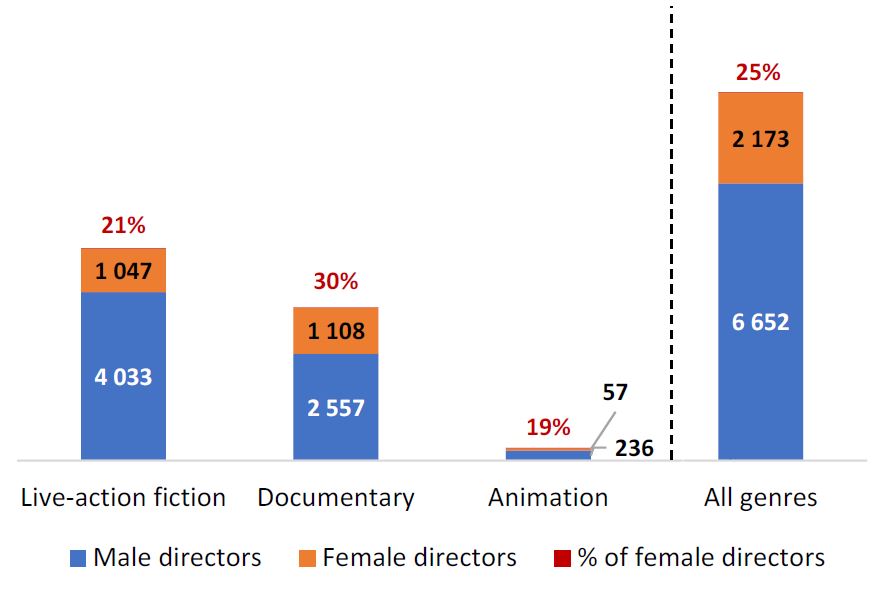 - Le documentaire est le genre cinématographique où la proportion de femmes est la plus élevée dans les équipes de tournage, tous métiers confondus. Ainsi, les femmes représentent 30 % des réalisateurs de documentaires, contre 21 % pour les films de fiction en prise de vue réelle.