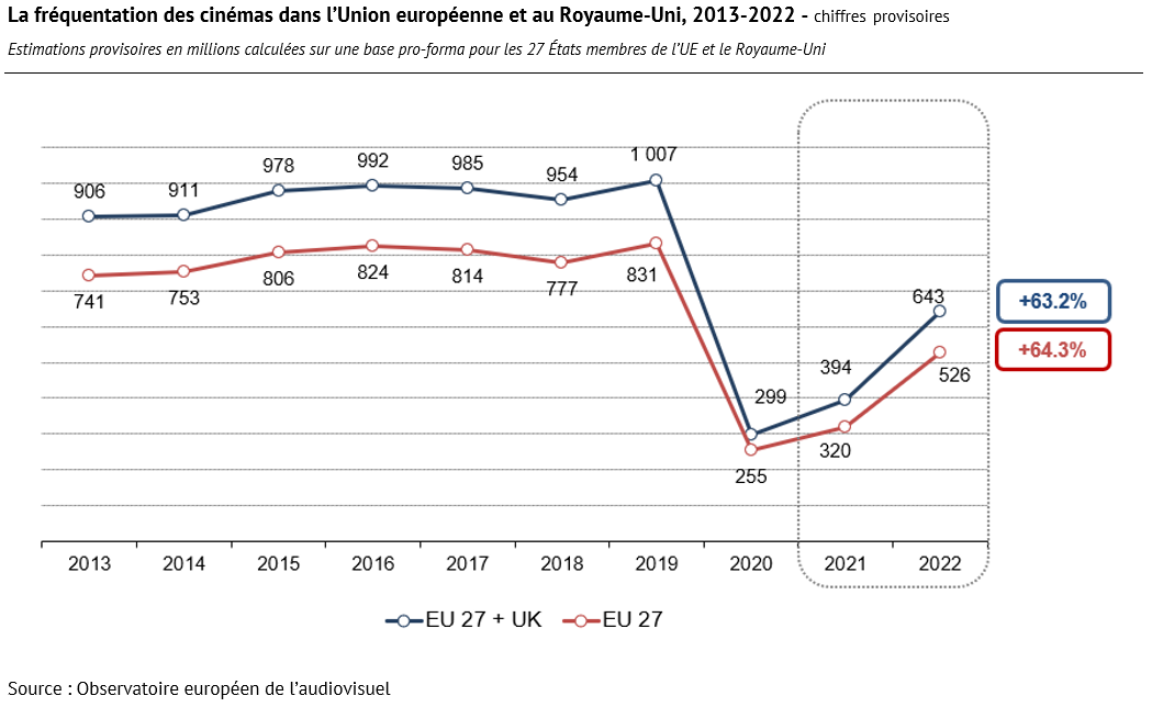 Sur la base des premières données collectées par l’Observatoire européen de l’audiovisuel, la fréquentation des salles de cinéma dans l’Union européenne et au Royaume-Uni atteint 643 millions d’entrées en 2022. Cela représente 249 millions d’entrées de plus qu’en 2021, soit une augmentation de 63 % en glissement annuel. On constate une reprise similaire si l’on considère uniquement l’Union européenne (UE27), où le nombre d’entrées est estimé à 525,8 millions en 2022, soit 205,7 millions d’entrées de plus qu’en 2021 (+64 % en glissement annuel).