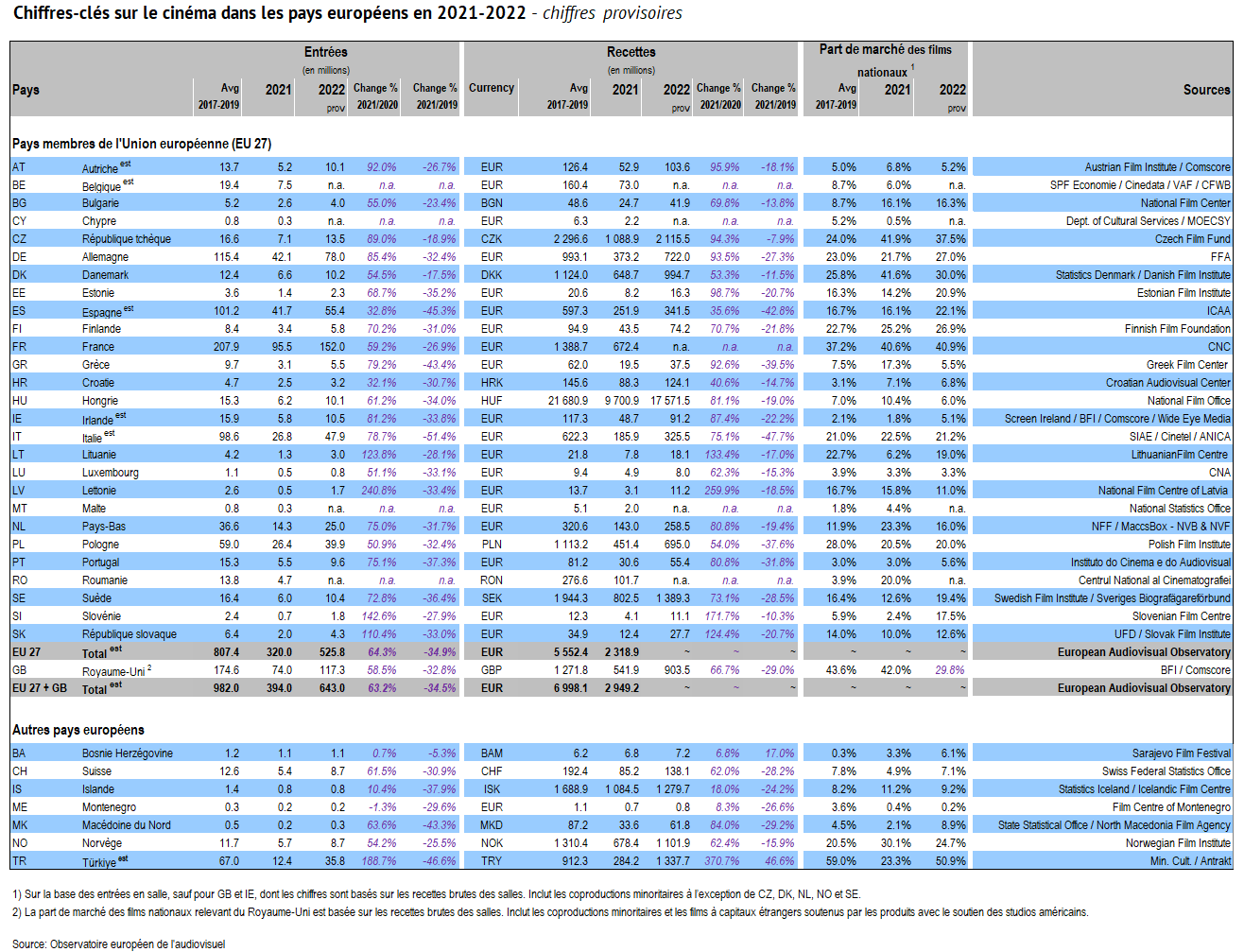 Chiffres-clés sur le cinéma dans les pays européens en 2021-2022 - chiffres provisoires